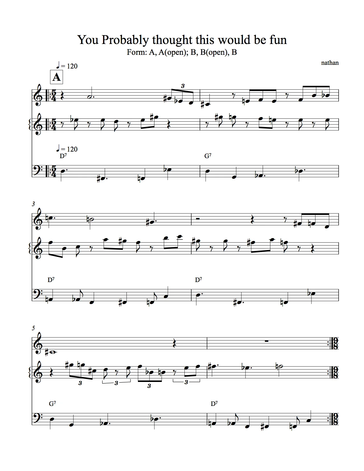 In this first edition breaking down the compositions from my album, PROGRESSIVE OVERLOAD, we’ll cover the first track: YOU PROBABLY THOUGHT THIS WOULD BE FUN. I began working on this tune in an airport during a long layover. I had been living in NYC for about nine months at this point, and there were some unexpected challenges not only with music, but with adapting to the lifestyle and culture of the big city. In that first writing session, I hashed out the harmonic and rhythmic basis of the A section, and during the following weeks I fleshed out the composition with the melody and the B section. When I compose, I use the computer. I once read that one of my favorite composers, Krzysztof Penderecki, composes in his garden away from any instruments. My imagination is not as sophisticated as Penderecki’s, but composing at the computer rather than the piano removes any bias towards muscle memory when I search for new ideas. I do my best to hear the parts clearly in my head (even singing them to myself if nobody is around) before replicating them in logic using software instruments. The title YOU PROBABLY THOUGHT THIS WOULD BE FUN references the shift in perspective I had between what I thought living in New York City would be like versus what my experience had actually been.