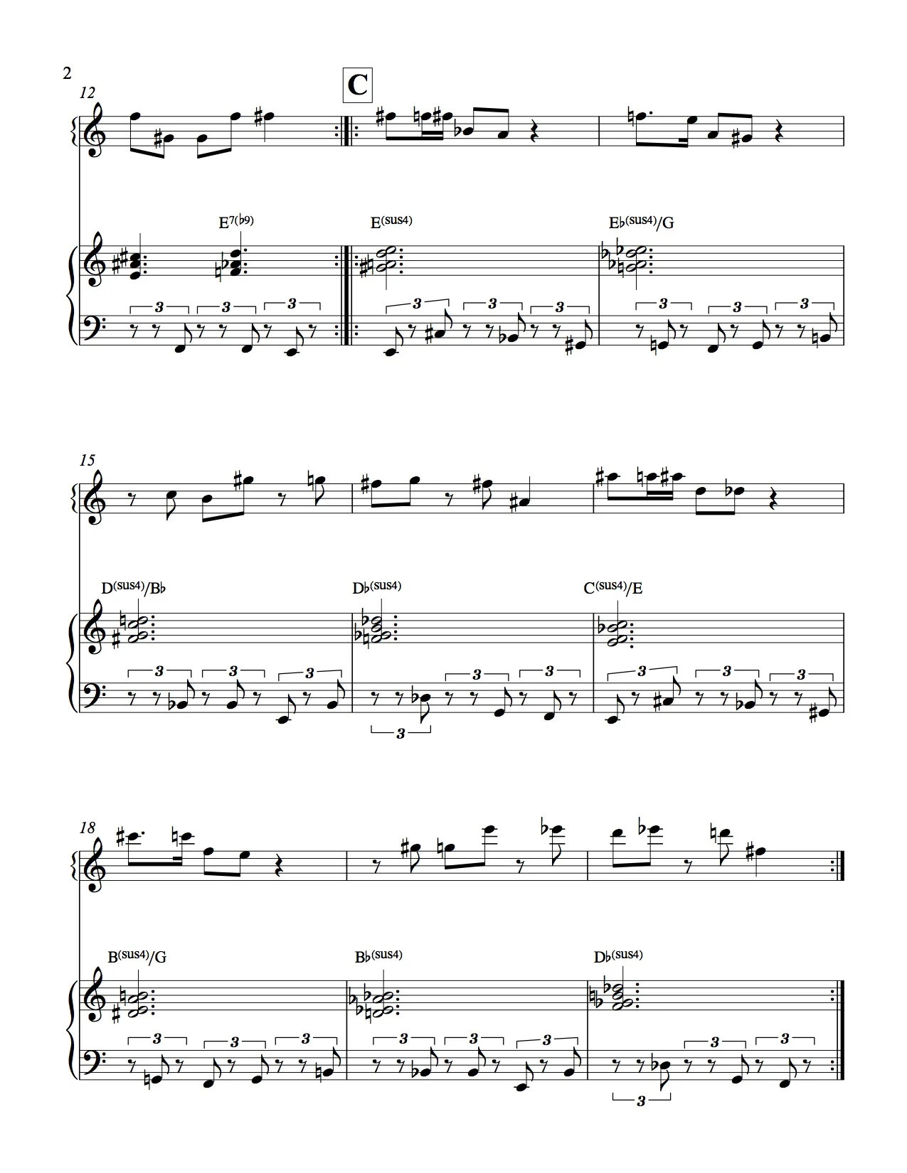 Harmonically, the B section is still based on the E half-half-whole nonatonic scale. Now the piano is playing the three diminished triads that fit into the 9 note scale (also separated by major thirds). These diminished triads are inverted for good voice leading. Meanwhile, the bass and drums have a new rhythm. One of my goals with this composition was to fit “modern jazz” rhythms into the aesthetics of “straight ahead” jazz. I use those terms for the sake of communication, but don’t put too much value on those labels. The song is still in 3/4 time, but there is an ostinato played by the bass and bass drum comprised of groupings of two and three triplets (2-3-3-2-2). From beginning to end, that takes up four beats. Three times through that four beat pattern is the same as four bars of 3/4 (the length of the B section).